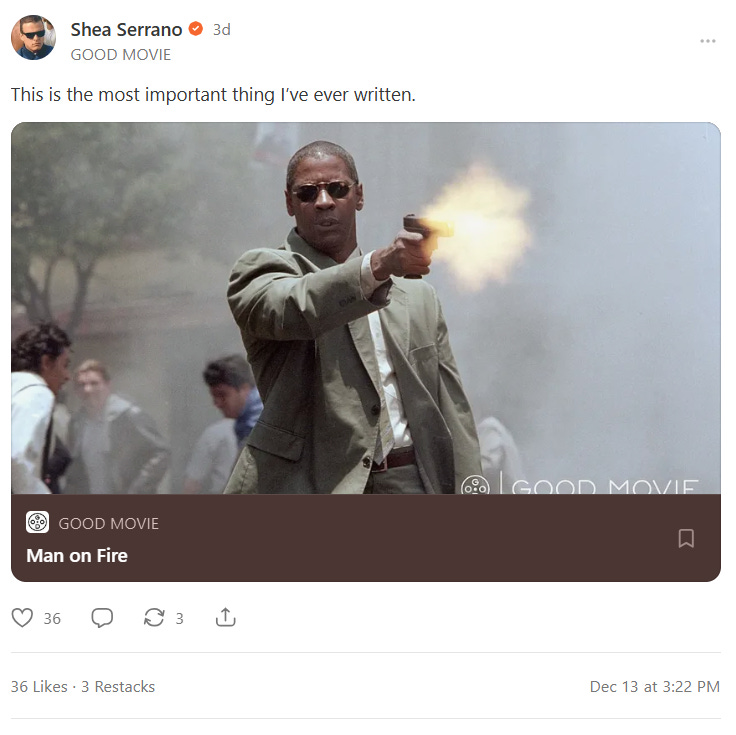 So maybe AI doesn’t know everything. Unsatisfied, I took a flier. I asked Serrano himself—via Substack direct message, via Good Movie.